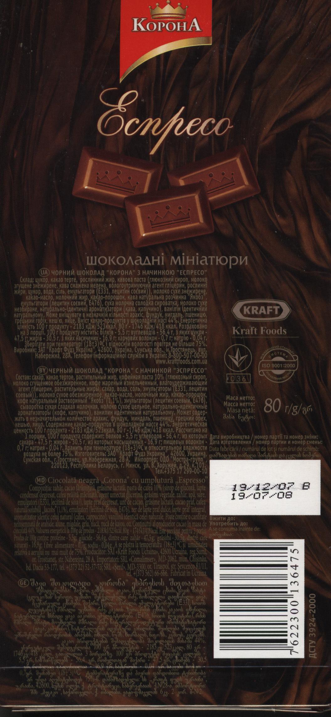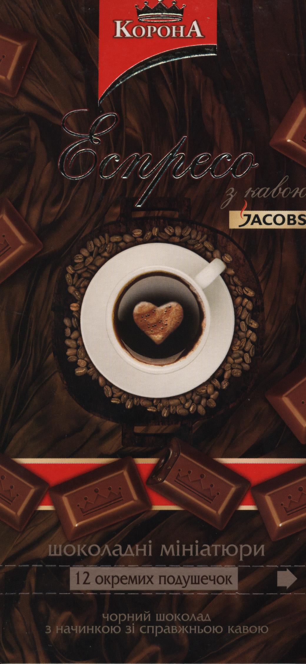 Корона \ Чорний шоколад з начинкою «еспресо» з кавою Jacobs \ Черный шоколад с начинкой «эспрессо»
