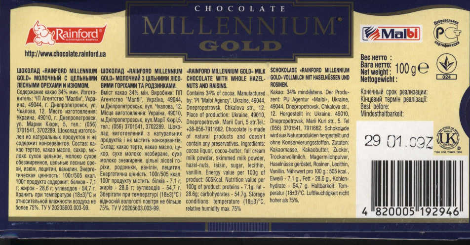 Rainford / Millennium goldRainford / Millennium gold / Молочный шоколад с цельными лесными орехами и изюмом
