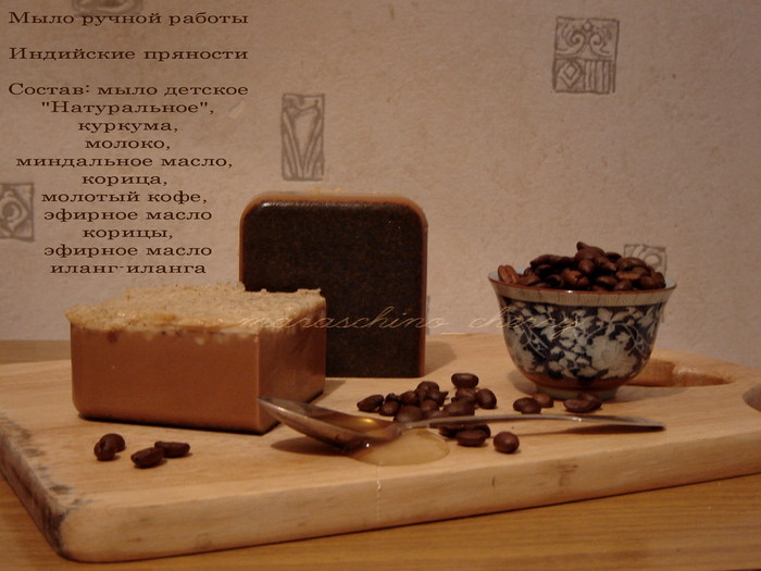 Состав: мыло ручной работы на основе молока, куркумы и корицы, со скрабом из молотого кофе.